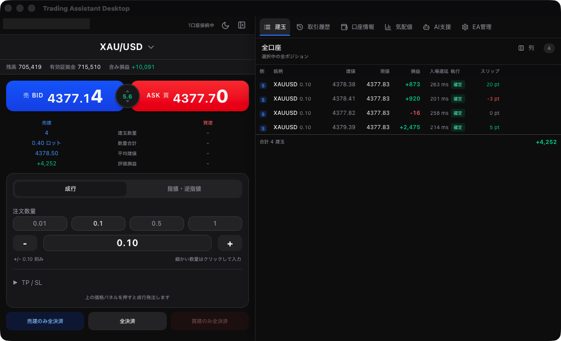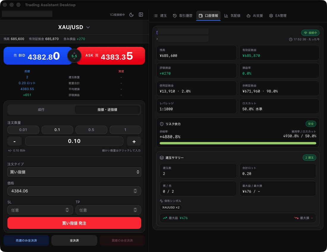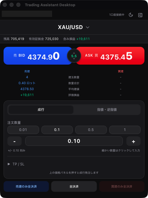 成行注文はもちろん、指値・逆指値・ストップリミットにも対応。ロットサイズのプリセットボタン(0.01/0.1/0.5/1)で瞬時にロット変更、TP/SLの事前設定で、チャンスを逃しません。Bid/Askの大きな価格表示とスプレッド表示で、相場状況を一目で把握できます。