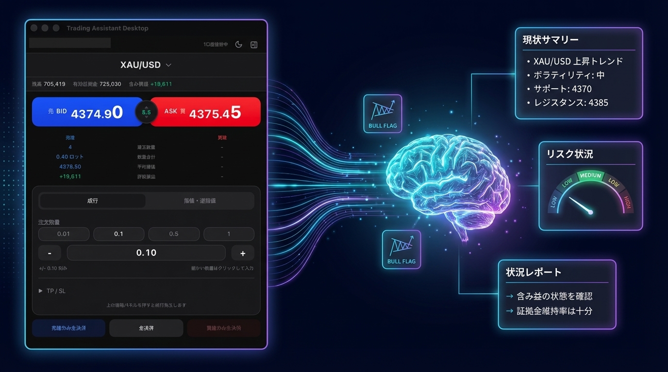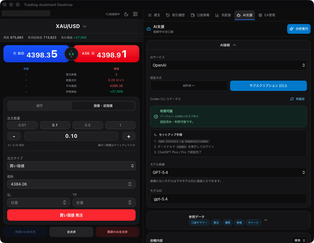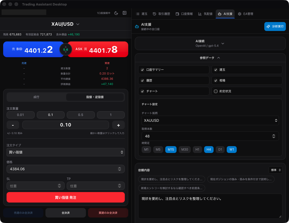 OpenAI(GPT-5.4等)やClaudeと連携し、現在のポジションデータをAIに送信できます。口座サマリー、建玉情報、取引履歴、相場データ、チャートバーデータを自動的にAIに送り、詳細な分析レポートを生成。証拠金維持率の評価やリスク状況の可視化など、データの整理・分析をAIが担います。